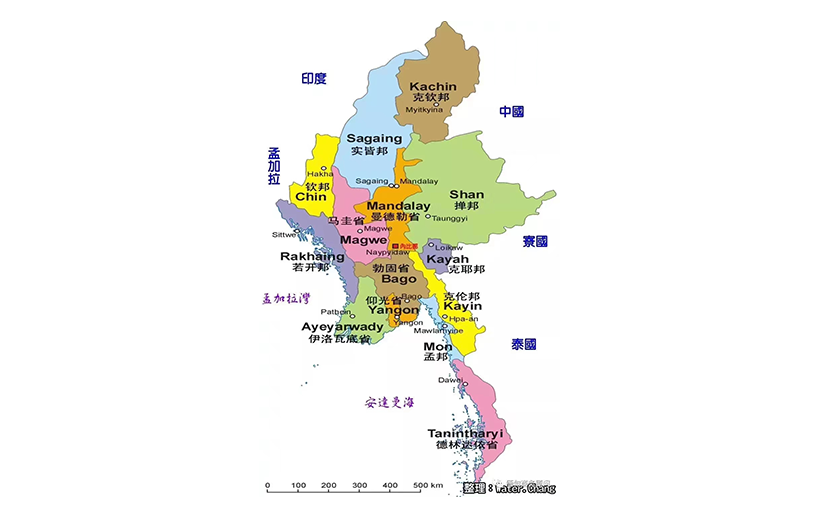 缅甸一共下辖7个省、7个邦和两个中央直辖市。省是缅族主要聚居地,7邦多为少数民族聚居地。